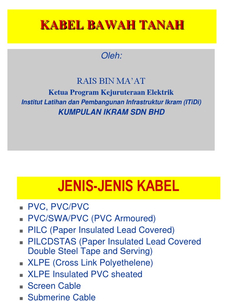 Kabel bawah tanah voltan rendah. 04 Testing and Commissioning of Standby Generator Set. RAIS BIN MAAT Ketua Program Kejuruteraan Elektrik Institut Latihan dan Pembangunan Infrastruktur Ikram ITiDi KUMPULAN IKRAM SDN BHD JENIS-JENIS KABEL.